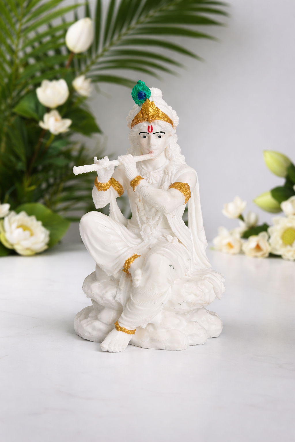 • Sacred Krishna Idol: Features Krishna, the beloved avatar of Vishnu, symbolizing love, joy, wisdom, and divine protection.